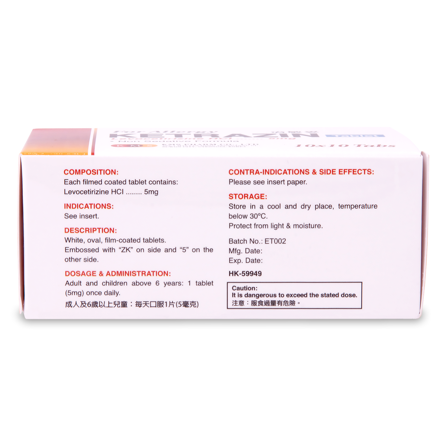 HK Reg. No.: HK-59949 Each filmed coated tablet contains: Levocetirizine HCl 5mg